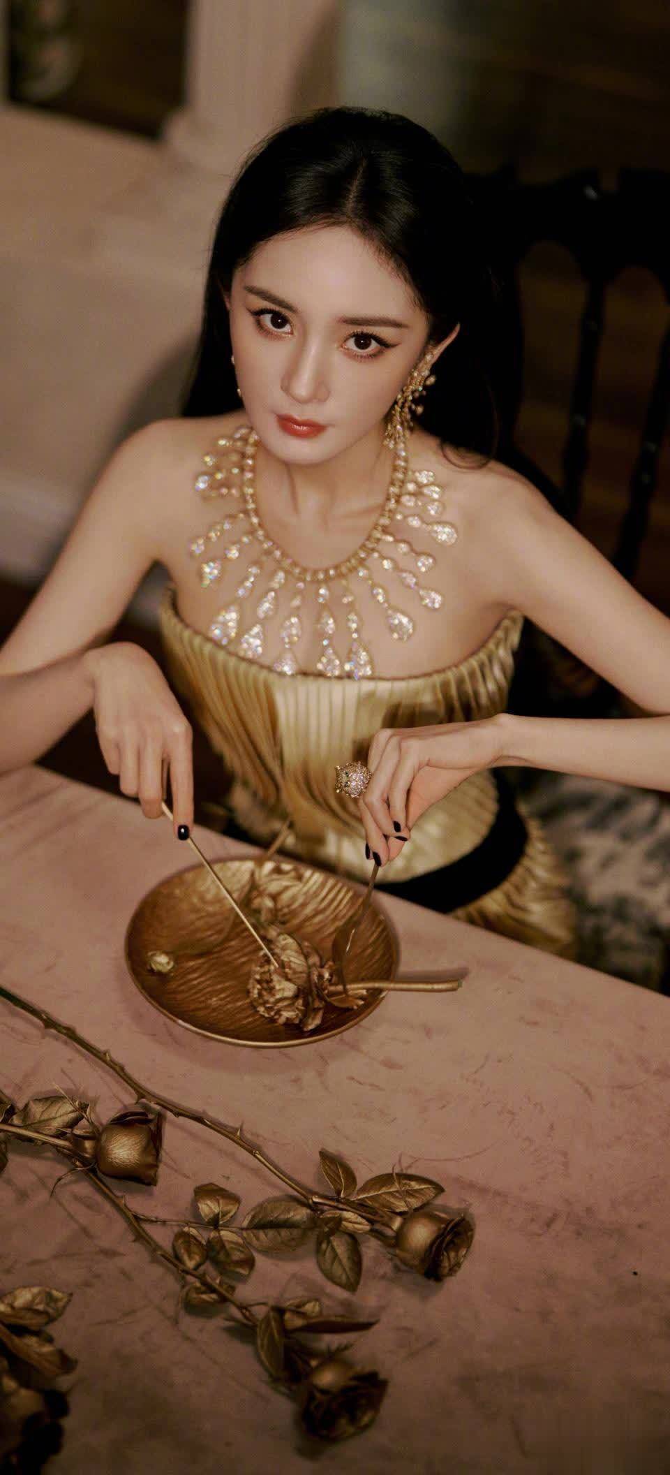 第三张照片中,杨幂半卧在地面,周围散落着陶瓷碎片,这种 “破碎感” 与她身上的金色礼服形成强烈反差。她的妆容温柔又带点疏离感,长发自然垂落,把 “脆弱感与贵气感并存”的风格演绎到极致。这种 “坚韧中的柔美”,在她的造型里也能找到影子。四、餐桌前的 “金色玫瑰”:细节里的时尚态度